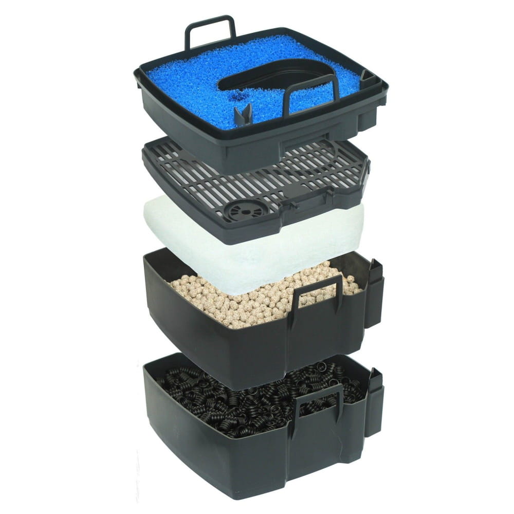 Indywidualne kosze filtracyjne na media biologiczne i mechaniczne. Kosze można łatwo wyjąć, a zawartość wyczyścić za pomocą siatki „Easy Clean”. Prosty do usunięcia i łatwy do czyszczenia.