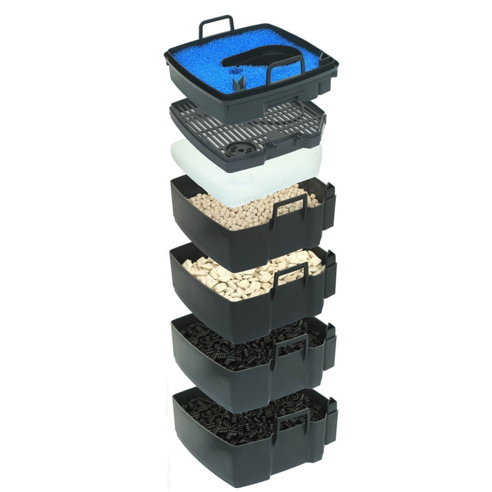 Indywidualne kosze filtracyjne na media biologiczne i mechaniczne. Kosze można łatwo wyjąć, a zawartość wyczyścić za pomocą siatki „Easy Clean”. Prosty do usunięcia i łatwy do czyszczenia.