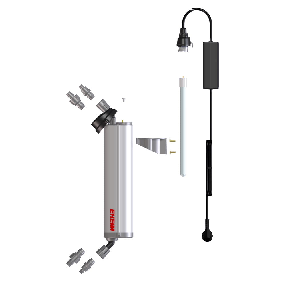 Akcesoria: Lampa EHEIM UV-C, element mocujący, statecznik z kablem zasilającym, 2x krany przyłączeniowe do węży ø 12/16 mm, 2x krany przyłączeniowe do węży ø 16/22 mm