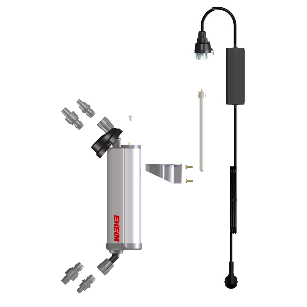 Akcesoria: Lampa EHEIM UV-C, element mocujący, statecznik z kablem zasilającym, 2x krany przyłączeniowe do węży ø 12/16 mm, 2x krany przyłączeniowe do węży ø 16/22 mm