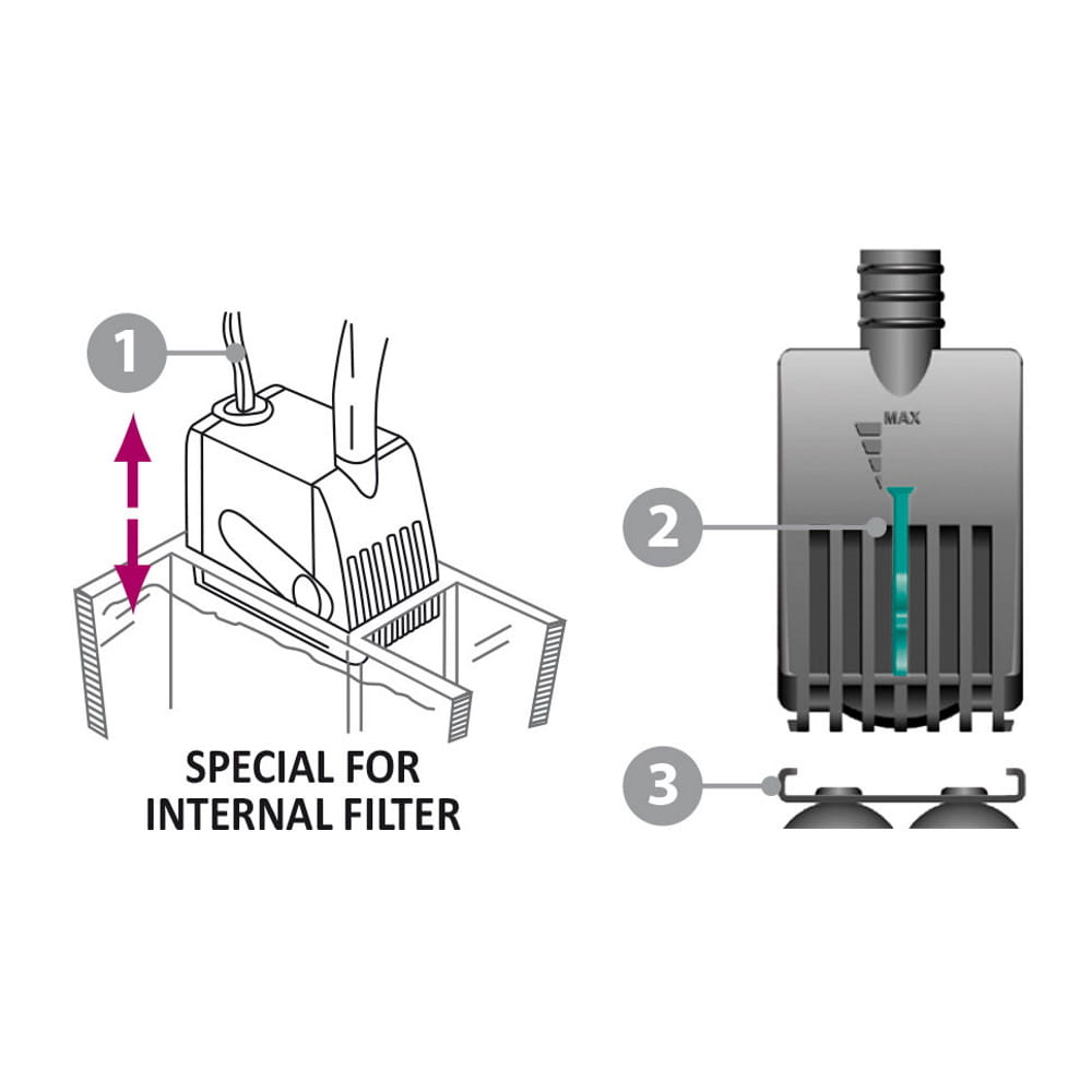 Zatapialna, ekonomiczna minipompa. Zminiaturyzowany, specjalny kształt pozwala na łatwe umieszczenie we wszystkich systemach filtrujących. Bezgłośna. Dzięki przewodowi zasilającemu umieszczonemu w górnej części, pompę można umieścić w wąskich miejscach. Minimalna konserwacja. Silnik zabezpieczony przed przegrzaniem. Minimalne zużycie energii. Regulowany przepływ.